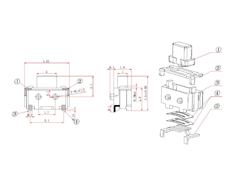 |  | | 型號規(guī)格:TST2435系列 | 中文命名:2*4*3.5 微型輕觸開關(guān) |